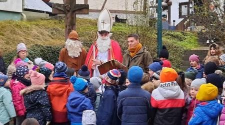 Inzwischen hatte sich auch der Kirchplatz ordentlich gefüllt, und nach dem Konzert war für die Kinder vor dem Nikolaus. Der ließ auch nicht sehr lange auf sich warten, fühlt er sich in ihrer Mitte am Wohlsten. Den Knecht Rupprecht hatte er zwar auch dabei, aber hauptsächlich als Träger für die vielen Geschenke für die Kleinen. Und die mussten sich diese auch durch das Vortragen von Liedern oder Gedichten verdienen – und das taten sie auch ausgiebig. Sehr zur Freude des Nikolaus.
